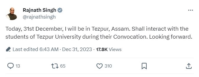 राजनाथ सिंह ने एक्स पर लिखा, "आज, 31 दिसंबर को मैं तेजपुर, असम में रहूंगा। तेजपुर विश्वविद्यालय के दीक्षांत समारोह के दौरान वहां के छात्रों से बातचीत करूंगा।"