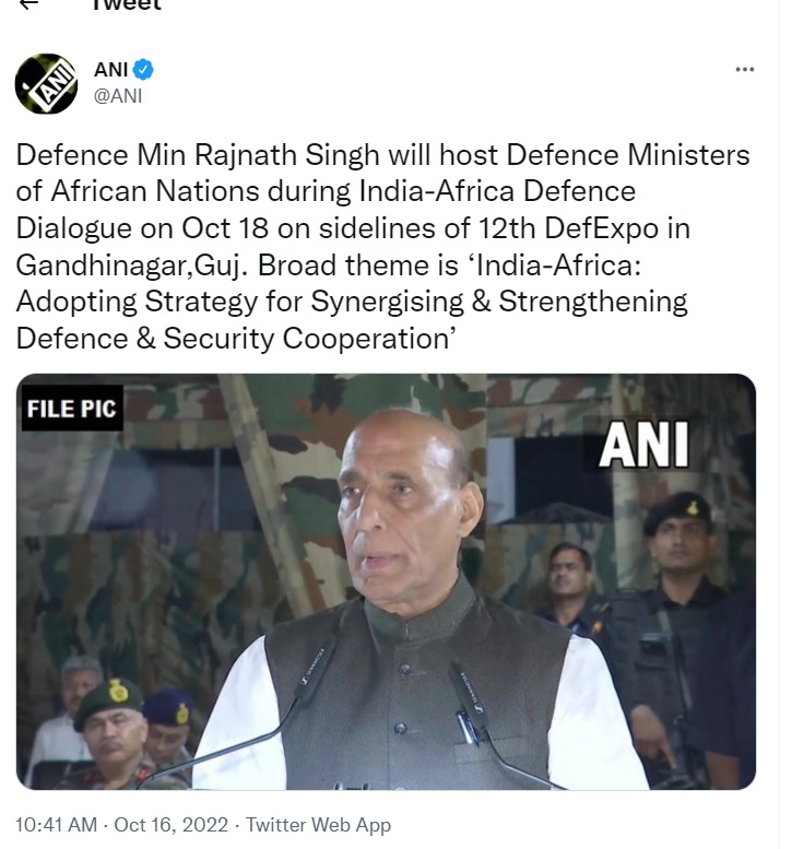 रक्षा मंत्री राजनाथ सिंह भारत-अफ्रीका रक्षा वार्ता के दौरान अफ्रीकी राष्ट्रों के रक्षा मंत्रियों की मेजबानी करेंगे।डिफेंस एक्सपो 18-22 अक्टूबर 2022 के बीच गुजरात के गांधीनगर में आयोजित होगा। बता दें कि डिफेंस एक्सपो का 12 वां संस्करण अब तक का सबसे बड़ा संस्करण होगा।
