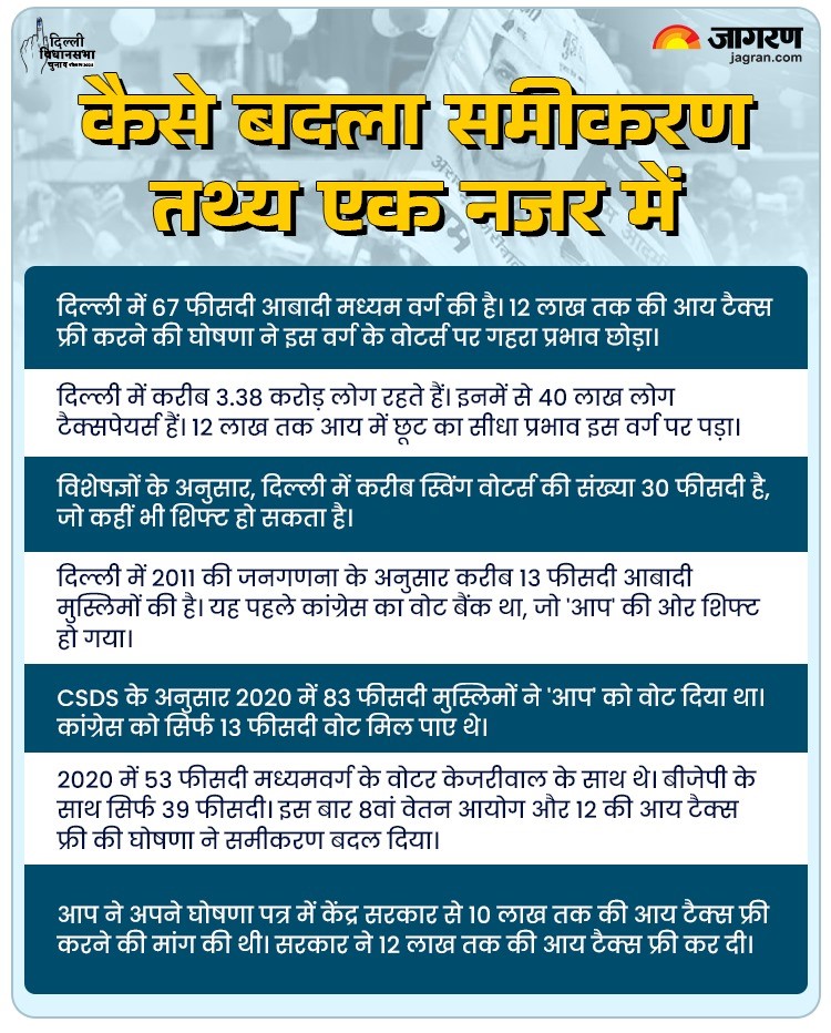- दिल्ली में करीब 3.38 करोड़ लोग निवास करते हैं। इनमें एक बड़ी आबादी मिडिल क्लास की है। करीब 67 फीसदी लोग मध्यम वर्ग में आते हैं। चुनाव से ठीक पहले बीजेपी ने बजट में 12 लाख रुपये तक की आय पर टैक्स में शत प्रतिशत छूट देकर मिडिल क्लास में खुशी की लहर दौड़ा दी।