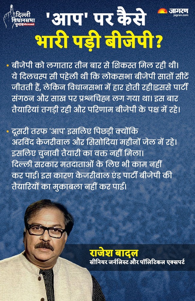 - डबल इंजन की सरकार: दिल्ली की जनता ने 10 साल केजरीवाल के शासन के बाद यह समझ लिया कि जेल, करप्शन और पार्टी में भितरघात व लगातार 'आप' छोड़ते नेताओं की 'रेलमपेल' की बजाय दिल्ली में इस बीजेपी पर विश्वास करना ही ज्यादा उचित होगा। इस कारण बीजेपी के लिए जमकर वोट डाले और प्रचंड जीत दिला दी।