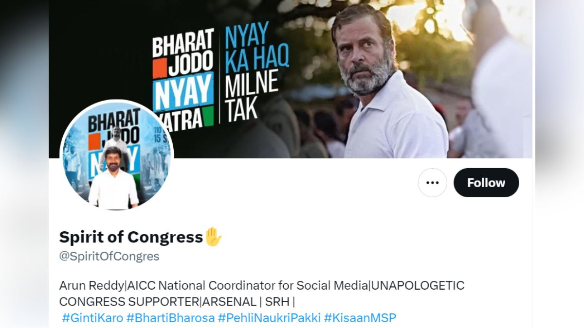 अरुण रेड्डी 'स्पिरिट ऑफ कांग्रेस' नामक एक्स अकाउंट का चलाते हैं। अरुण रेड्डी खुद को कांग्रेस समर्थक बताते हैं और उन्होंने अपनी प्रोफाइल में खुद को सोशल मीडिया में एआईसीसी का नेशनल कोऑर्डिनेटर बताया है। इसके अलावा उन्होंने राहुल गांधी के 'भारत जोड़ो न्याय यात्रा' के पोस्टर वाली खुद की तस्वीर लगाई है।