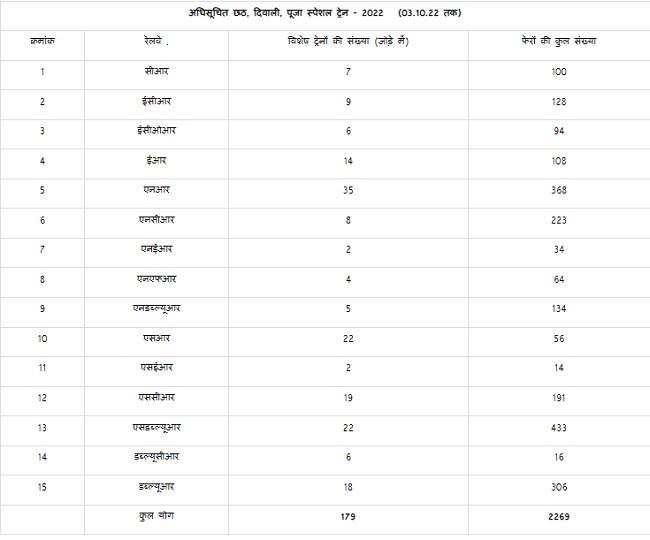 नई दिल्ली आनलाइन डेस्क।Indian Railways Special Trains List 2022: दिवाली और छठ के मौके पर यूपी और बिहार की तरफ जाने वाली ट्रेनों में पैर रखने तक की जगह का मिलना मुश्किल हो जाता है। ऐसे में त्योहारों के समय लोगों को उनके परिवार के पास पहुंचाने के लिए रेलवे ने बड़ी संख्या में स्पेशल ट्रेनें चलाने का फैसला किया है। ट्रेनों में भारी भीड़ को मैनेज करने के लिए इंडियन रेलवे ने फेस्टिव स्पेशल ट्रेनें चलाने का सला किया है।. रेलवे ने छठ तक 179 फेस्टिव स्पेशल ट्रेनों को चलाने का फैसला किया है। ये 179 जोड़ी ट्रेनें इस दौरान 2268 फेरे लगाएंगी।