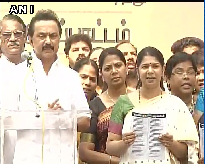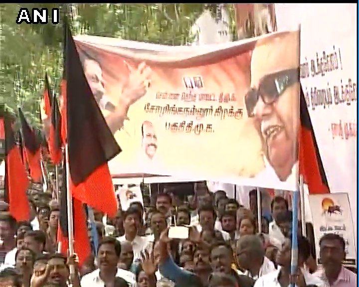 प्रदर्शन कर रहे डीएमके के कार्यकर्ता कलेक्टर के कार्यालय के पास एकत्रित हो गए। पार्टी के अध्यक्ष एम के स्टालिन और कनिमोझी भी प्रदर्शन में शामिल हैं।