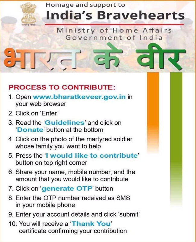 भारत सरकार के केंद्रीय गृह मंत्रालय ने अपने शहीद जवानों के परिवार की आर्थिक मदद के लिए 2017 में विशेष तौर पर भारत के वीर (Bharat Ke Veer) नाम से वेबसाइट www.bharatkeveer.gov.in और मोबाइल एप लॉच किया था। इस सरकारी वेबसाइट के जरिए देश की आम जनता शहीदों के परिवारो को आसानी से आर्थिक मदद पहुंचा सकती है।