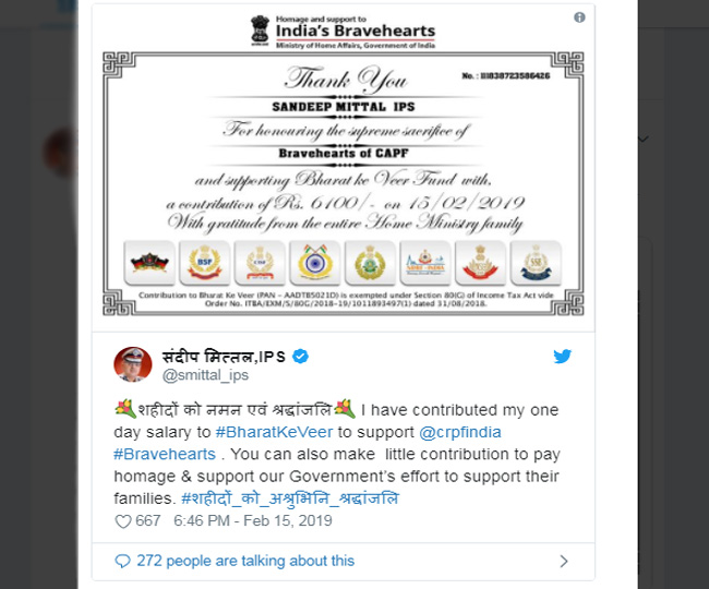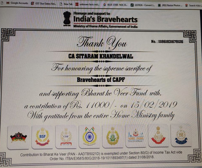 Pulwama Terror Attack में 40 जवानों के शहीद होने की घटना के बाद से https://bharatkeveer.gov.in वेबसाइट पर लोग जमकर दान कर रहे हैं। यहां दान करने के दानकर्ता के नाम से एक प्रमाण पत्र जारी किया जाता है। इस प्रमाण पत्र के जरिए दान की हुई रकम पर आप आयकर में छूट प्राप्त कर सकते हैं।