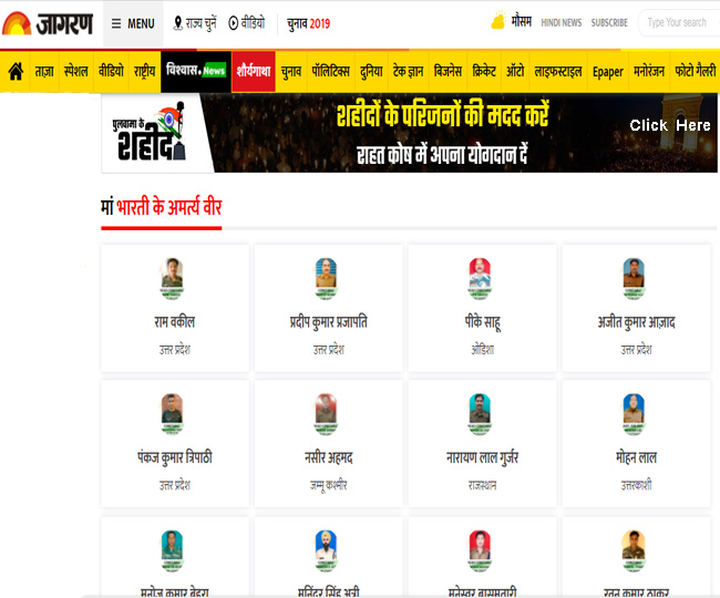 इसके अलावा आप दैनिक जागरण की खास पहल ‘पुलवामा के शहीद’ से जुड़कर भी आप शहीदों के परिजनों की आर्थिक मदद कर सकते हैं। इसके लिए आप जागरण की वेबसाइट jagran.com पर जाकर 'पुलवामा के शहीद' लिंक पर क्लिक करें। पुलवामा के शहीदों को श्रद्धांजलि देने के लिए इस पेज को विशेष तौर पर तैयार किया गया है। यहां भी शहीदों के परिजनों की मदद करने और राहत कोष में योगदान देने के लिए एक लिंक दिया गया है। इस लिंक पर क्लिक करके आप सीधे 'bharatkeveer.gov.in' पर पहुंच जाएंगे। क्लिक हेयर टू कंप्ट्रीब्यूट पर क्लिक करके आप जिस भी शहीद के परिजनों की मदद करना चाहें, उनका चुनाव करके सीधे उन्हें मदद पहुंचा सकते हैं।