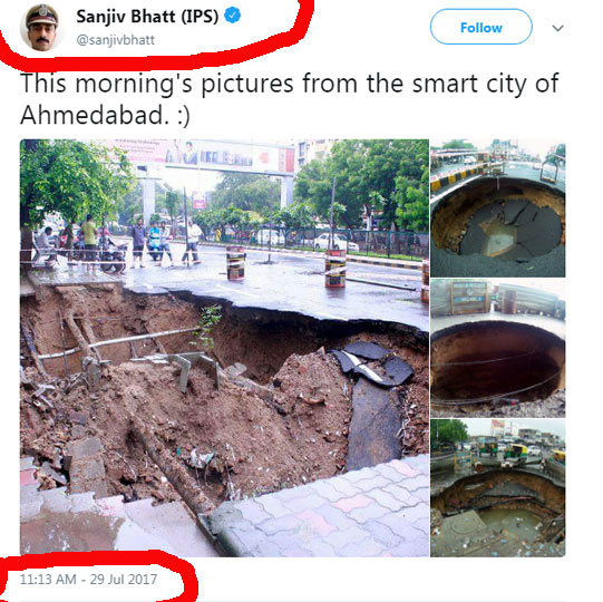 इसी तस्वीर को दिव्या से पहले 29 जुलाई 2017 को गुजरात कैडर के आईपीएस अफसर रह चुके संजीव भट्ट ने भी ट्वीट किया था। भट्ट ने भी इसे अहमदाबाद का ही बताया था। यह तस्वीर शहर के स्वास्तिक चौराहे के पास की है। जुलाई 2017 में भारी बारिश के बाद यह सड़क धंस गई थी।