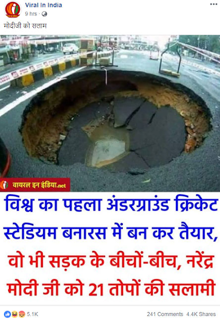 वाराणसी की बतायी जा रही यह तस्वीर सच में डरावनी तो है, लेकिन वाराणसी की है या नहीं यह सोशल मीडिया पर आंख बंद करके भरोसा करने वाले नहीं जानते थे। इस तस्वीर को लेकर वाराणसी का होने का दावा करने के साथ ही इसके नीचे तंज कसते हुए लिखा गया, 'विश्व का पहला अंडर ग्राउंड क्रिकेट स्टेडियम बन कर तैयार है। वो भी सड़क के बीचों-बीच। नरेंद्र मोदी जी को 21 तोपों की सलामी।'