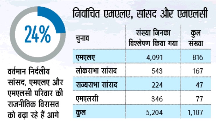 लोकसभा में करीब एक तिहाई सांसद वंशवाद की उपज हैं या परिवार की राजनीतिक विरासत को आगे बढ़ा रहे हैं, वहीं राज्यों की विधानसभाओं में ऐसे सदस्य 20 प्रतिशत हैं। एसोसिएशन फार डेमोक्रेटिक रिफार्म्स (एडीआर) के अनुसार यह दिखाता है कि राष्ट्रीय राजनीति में प्रवेश पर स्थापित राजनीतिक परिवारों का कड़ा नियंत्रण है ।