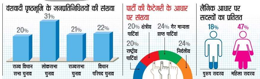 वंशवादी राजनीति में महिलाओं का दबदबा दिख रहा है। ऐसी पृष्ठभूमि से आने वाली महिला सदस्यों का प्रतिशत 47 है जबकि पुरुष सदस्यों का प्रतिशत 18 है। झारंखड में 73 प्रतिशत और महाराष्ट्र में 69 प्रतिशत महिला जनप्रतिनिधि राजनीति में पारिवारिक विरासत को आगे बढ़ा रही हैं।
