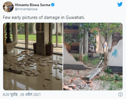 भूकंप के झटके के बाद अब असम से नुकसान की तस्वीरें सामने आने लगी है। राज्य के स्वास्थ्य मंत्री हिमंता बिस्वा सरमा ने दो तस्वीरें शेयर की है। इसमें भूकंप के तेज झटकों से होने वाला नुकसान दिख रहा है। तस्वीरों में घर की दीवारें टूटकर जमीन पर गिरी नजर आ रही हैं।