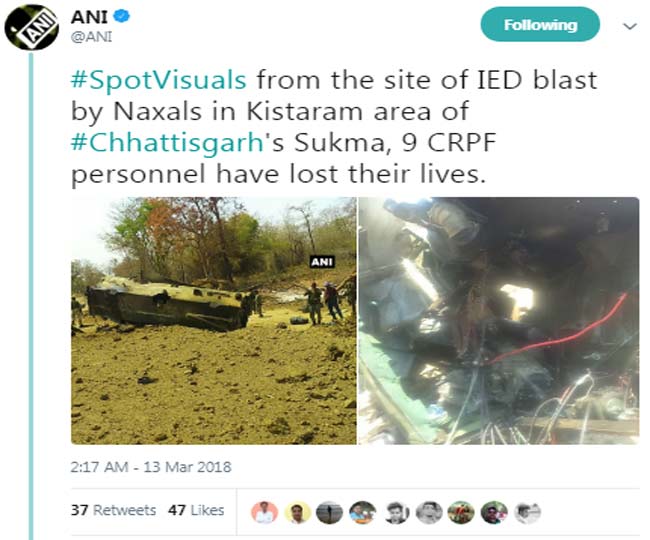 गृहमंत्री राजनाथ सिंह ने ट्वीट कर नक्सली हमले में शहीद जवानों के प्रति दुख और संवेदना जाहिर की। उन्होंने ट्वीट में कहा,'शहीद जवानों के परिवार के प्रति मेरी हार्दिक संवेदनाएं हैं। घायल सैनिकों के शीर्घ स्वस्थ होने की कामना करता हूं। मैंने सुकमा घटना के बारे में डीजी सीआरपीएफ से बात की और छत्तीसगढ़ जाने को कहा है।' नक्सल रोधी ऑपरेशन के स्पेशल डीजी, डीएम अवस्थी ने बताया, 'किस्टाराम से पलोडी जा रही पैट्रोलिंग पार्टी पर नक्सलियों ने आइइडी ब्लास्ट किया। अतिरिक्त सैन्य बल मौके पर पहुंच गयी है। फिलहाल फायरिंग बंद है।'