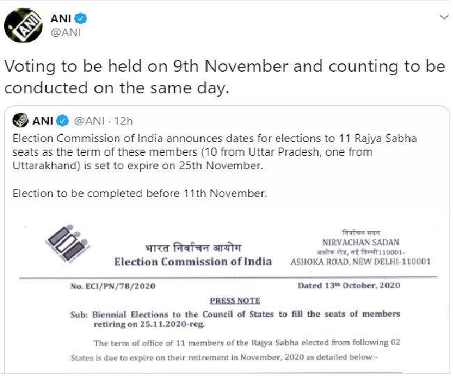 नई दिल्ली, एएनआइ। भारत चुनाव आयोग (Election Commission of India) ने राज्यसभा की 11 सीटों के लिए चुनाव की तारीखों का एलान कर दिया है। ये चुनाव 9 नवबंर को कराए जाएंगे और इसी दिन नतीजों की भी घोषणा कर दी जाएगी। 11 सीटों में 10 सीट उत्तर प्रदेश से तो वहीं एक सीट उत्तराखंड से है। इन सीटों से सदस्यों को कार्यकाल 25 नवंबर को समाप्त होने वाला है। 11 नवंबर से पहले चुनाव को पूरा किया जाना है। वहीं चुनाव के नतीजे वोटिंग वाले दिन शाम को घोषित कर दिए जाएंगे।