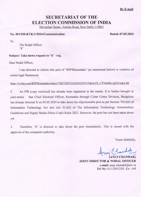Lok Sabha Election चुनाव आयोग ने सोशल मीडिया वेबसाइट X को आदेश दिया है कि वो कर्नाटक बीजेपी के आपत्तिजनकर पोस्ट को तुरंत अपने प्लेटफॉर्म से हटाए। इससे पहले कर्नाटक चुनाव आयोग ने बीजेपी को Xहैंडल से यह पोस्ट हटाने का आदेश दिया था। आयोग ने कहा है कि एक्स को पांच मई को ही उस पोस्ट को हटाने को कहा था लेकिन उसे अब तक नहीं हटाया गया है।