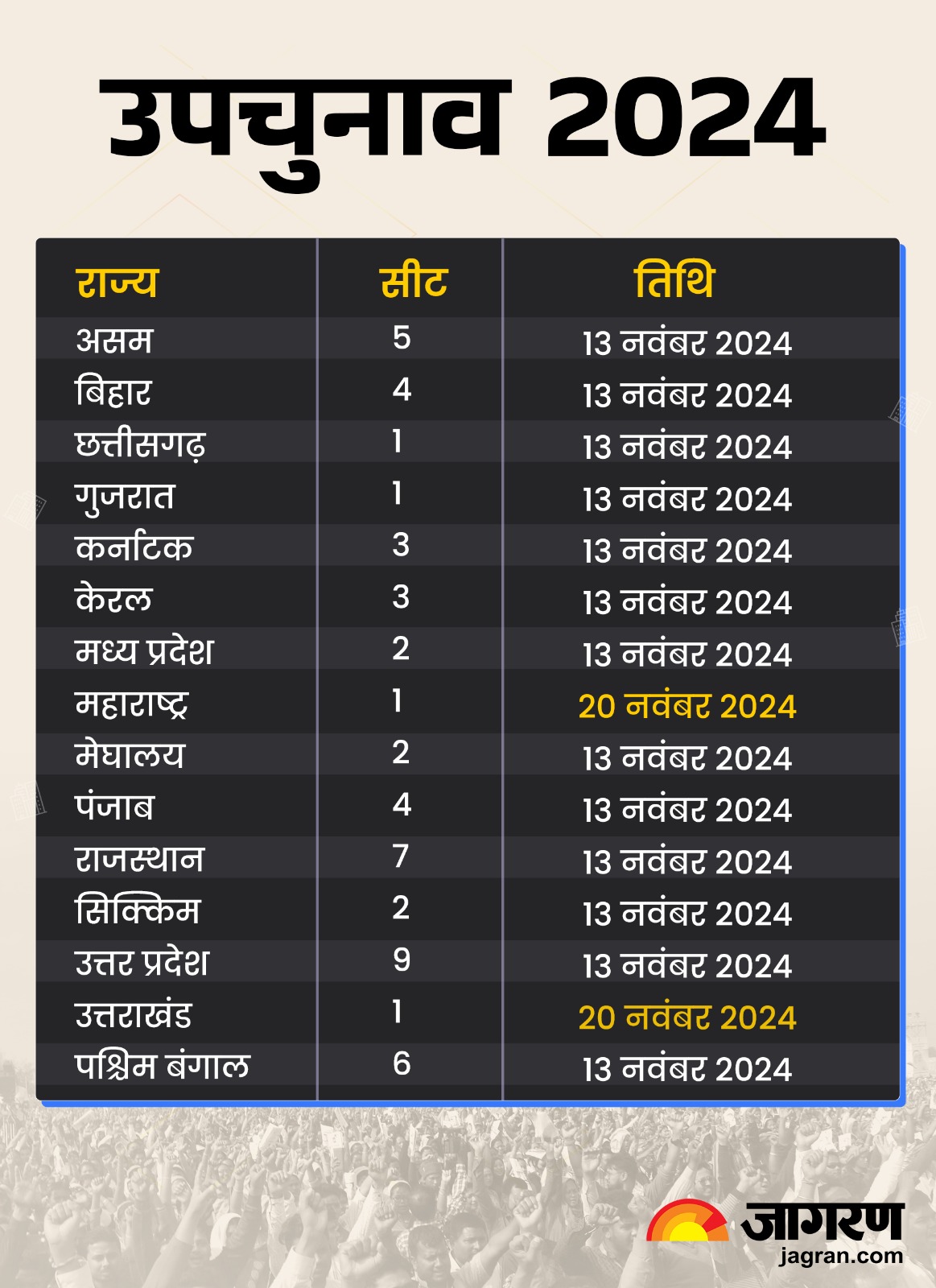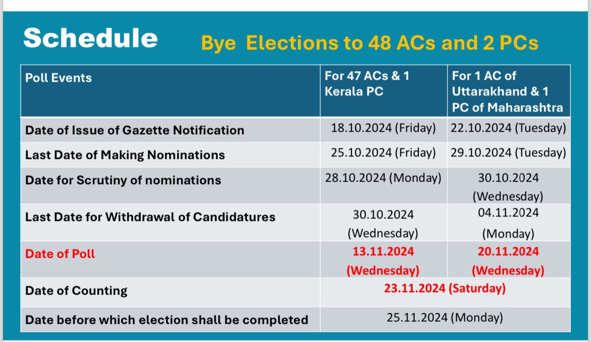 केरल की वायनाड लोकसभा सीट के साथ-साथ 13 राज्यों की 47 विधानसभा सीटों के लिए 13 नवंबर को उपचुनाव होंगे और महाराष्ट्र की नांदेड़ और उत्तराखंड की केदारनाथ विधानसभा सीट के लिए 20 नवंबर को उपचुनाव होंगे।