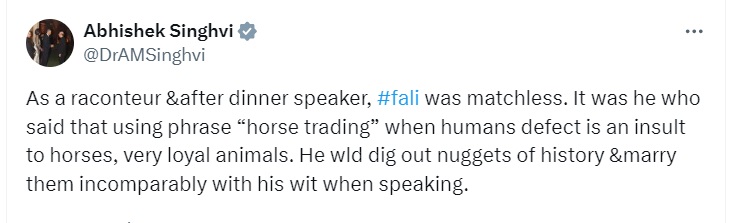 अभिषेक सिंघवी ने आगे लिखा," उन्होंने कहा था कि इंसानों की गलती पर हॉर्स ट्रेडिंग वाक्य का इस्तेमाल घोड़ों का अपमान है, जो बहुत वफादार जानवर हैं. वह इतिहास के गूढ़ रहस्य खोज निकालते थे और बोलते समय अपनी बुद्धि से उन्हें अतुलनीय ढंग से जोड़ते थे।"