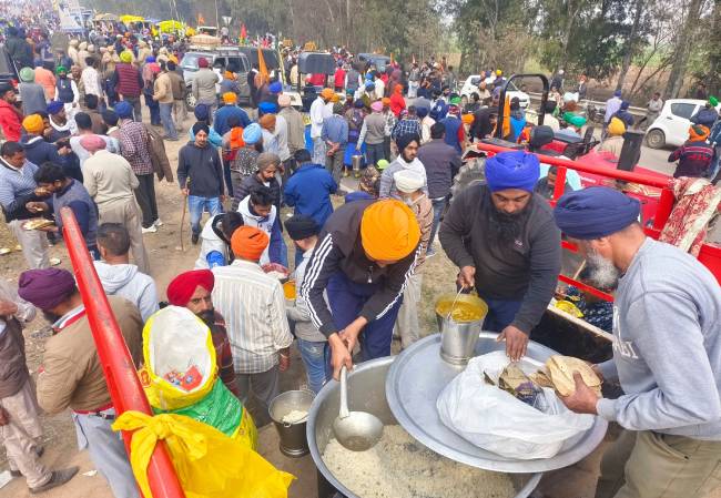 नई दिल्ली की ओर मार्च कर रहे किसान शंभू, भारत में पंजाब-हरियाणा सीमा के पास भोजन वितरित किया।