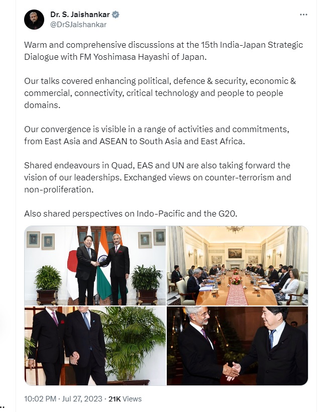 जयशंकर ने एक ट्वीट में 15वीं भारत-जापान रणनीतिक वार्ता को गर्मजोशी भरी और व्यापक करार दिया। उन्होंने कहा, 'हमारी वार्ता में राजनीतिक, रक्षा एवं सुरक्षा, आर्थिक एवं वाणिज्यिक, कनेक्टिविटी और दोनों देशों के बीच संपर्क के मुद्दे शामिल थे। हमारा जुड़ाव पूर्वी एशिया व आसियान से लेकर दक्षिण एशिया व पूर्वी अफ्रीका तक कई गतिविधियों और प्रतिबद्धताओं में दिखाई देता है।'