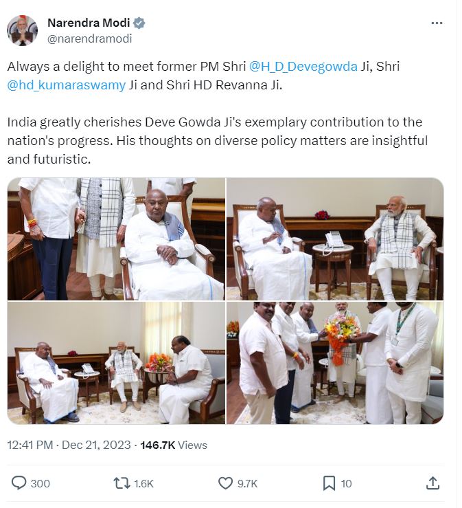 प्रधानमंत्री ने एक्स पर एक पोस्ट में कहा, उनसे मिलना हमेशा सुखद होता है। मोदी ने कहा, "भारत देश की प्रगति में देवेगौड़ा जी के अनुकरणीय योगदान को बहुत महत्व देता है। विविध नीतिगत मामलों पर उनके विचार व्यावहारिक और भविष्यवादी हैं।"