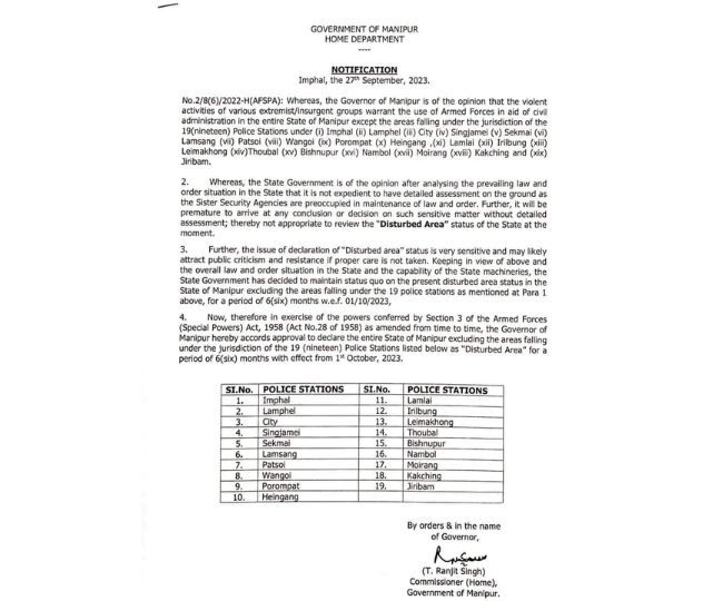 बुधवार को सरकार द्वारा जारी अधिसूचना में बताया गया, मणिपुर के 19 पुलिस स्टेशनों को छोड़कर पूरे क्षेत्र को छह महीने के लिए अशांत क्षेत्र घोषित किया जाता है। बताया गया कि अफस्पा कानून एक अक्टूबर, 2023 से प्रभावी होगा।