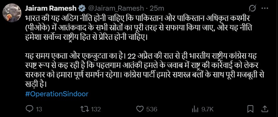 भारतीय सेना द्वारा की गई एयर स्ट्राइक के बाद कांग्रेस की ओर से प्रतिक्रिया सामने आई है। कांग्रेस ने ऑपरेशन सिंदूर पर प्रतिक्रिया जाहिर करते हुए कहा है कि पाकिस्तान और पीओके में आतंकवाद के सभी स्रोतों को नष्ट करने की भारत और प्रतिबद्धता सर्वोच्च राष्ट्रीय हित में निहित है। कांग्रेस के वरिष्ठ नेता जयराम रमेश ने इस ऑपरेशन को लेकर कहा कि एकता और एकजुटता का समय है।