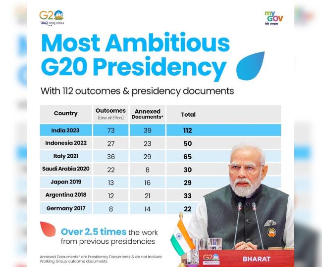 G20 इतिहास में सबसे ज्यादा सफल रहा भारत की अध्यक्षता में सम्मेलन, 112 कार्यों को दिया गया अंतिम रूप