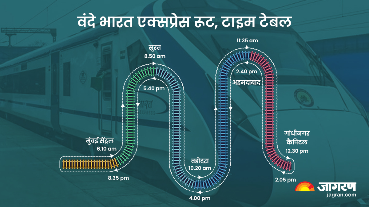 वंदे भारत एक्सप्रेस मुंबई सेंट्रल से सुबह 6:10 बजे प्रस्थान करेगी और दोपहर 12:30 बजे गांधीनगर पहुंचेगी। ट्रेन सूरत में सुबह 8:50 बजे, वडोदरा में 10:20 बजे और अहमदाबाद में 11:35 बजे पहुंचेगी।
