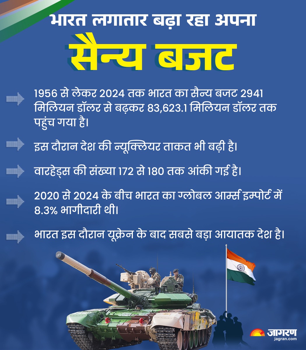 1956 से लेकर 2024 तक भारत का खर्च 2941 मिलियन डॉलर से बढ़कर 83,623.1 मिलियन डॉलर तक पहुंच गया है। इस दौरान देश की न्यूक्लियर ताकत भी बढ़ी है और वारहेड्स की संख्या 172 से 180 तक आंकी गई है। यह आंकड़ा बताता है कि भारत अपनी सुरक्षा के लिए हर कदम मजबूती से उठा रहा है।