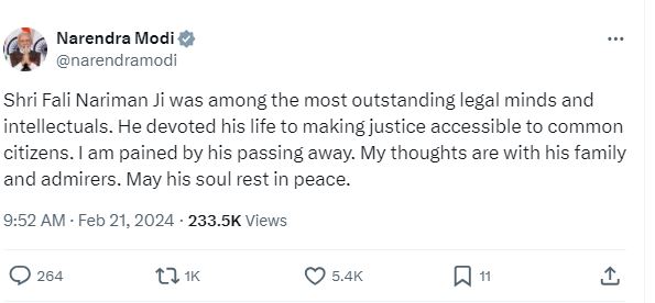 प्रधानमंत्री नरेंद्र मोदी ने ट्वीट कर कहा, ‘फली नरीमन सबसे उत्कृष्ट कानूनी दिमाग और बुद्धिजीवियों में से थे। उन्होंने अपना जीवन आम नागरिकों के लिए न्याय को सुलभ बनाने के लिए समर्पित कर दिया। उनके निधन से मुझे दुख हुआ है। मेरी संवेदनाएं उनके परिवार और प्रशंसकों के साथ हैं। भगवान उनकी आत्मा को शांति दे।’