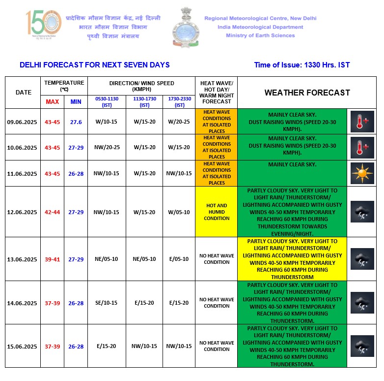 दिल्ली के मौसम की बात करें तो इस पूरे हफ्ते भीषण गर्मी का सितम देखने को मिलेगा। मौसम विज्ञान विभाग ने बताया कि आने वाले दिनों में कुछ स्थानों पर पारा 44 डिग्री सेल्ससियस के पार भी जा सकता है। वहीं, 13 जून के बाद तापमन में थोड़ी कमी देखने को मिल सकती है।