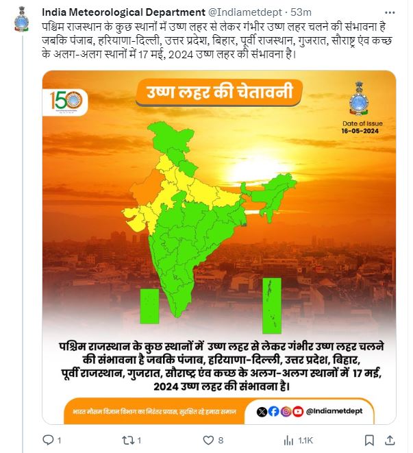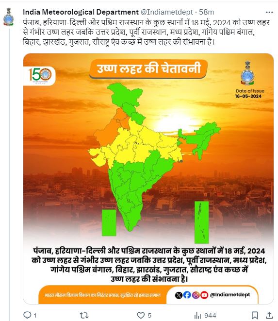 आईएमडी ने 17 से 20 मई तक पश्चिमी राजस्थान पंजाब हरियाणा और दिल्ली के कुछ हिस्सों में भीषण गर्मी की चेतावनी दी है। वहीं16 से 20 मई तक पूर्वी राजस्थान उत्तर प्रदेश और उत्तरी मध्य प्रदेश के साथ-साथ इन क्षेत्रों के अलग-अलग इलाकों में लू चलने की भी संभावना है। मौसम विभाग ने कहा कि सप्ताह के अंत में दिल्ली में तापमान 45 डिग्री सेल्सियस तक पहुंचने की संभावना है।