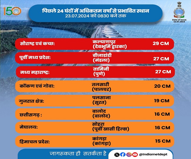 ऑनलाइन डेस्क, नई दिल्ली। भारतीय मौसम विभाग (IMD) ने मंगलवार (23 जुलाई) के लिए रेड अलर्ट जारी किया है। मौसम विभाग ने जिन राज्यों के लिए भविष्यवाणी जताई है उसमें गुजरात, महाराष्ट्र और गोवा शामिल है। इन राज्यों के लिए मौसम विभाग ने भारी बारिश की संभावना जताई है।