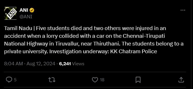 Road Accident in Tamil Nadu तमिलनाडु के तिरुवल्लूर से एक दर्दनाक सड़क हादसे की खबर सामने आ रही है। यह हादसा तिरुवल्लूर में चेन्नई-तिरुपति राष्ट्रीय राजमार्ग पर घटित हुआ। एक ट्रक और कार की भीषण टक्कर के बाद यह हादसा हुआ। इस घटना में पांच छात्रों की मौत हो गई। वहीं दो लोग घायल बताए जा रहे हैं। पुलिस हादसे की जांच कर रही है।