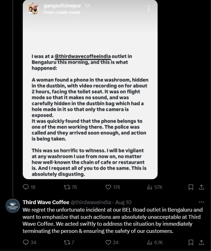 इस घटना पर अब कॉफी शॉप की भी प्रतिक्रिया सामने आई है। कॉफी शॉप के प्रबंधन ने इस घटना पर प्रतिक्रिया देते हुए कहा, 'हमारे ग्राहकों की सुरक्षा और भलाई हमेशा हमारी प्राथमिकता है। कॉफी शॉप की नीति सख्त है और बीईएल रोड स्टोर में संदिग्ध व्यक्ति को तुरंत नौकरी से निकाल दिया गया है, साथ ही आवश्यक कानूनी कार्रवाई शुरू की गई है।'