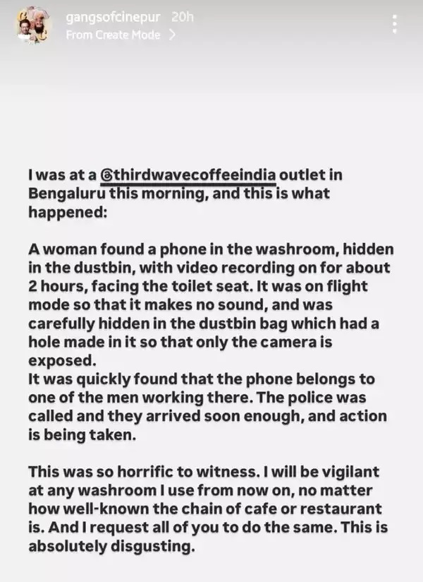 घटना शनिवार की बताई जा रही है। घटना के दौरान कॉफी शॉप में मौजूद एक ग्राहक ने सोशल मीडिया पर इसकी जानकारी साझा की है। उसने बताया कि मोबाइल के वीडियो रिकॉर्डिंग फंक्शन को चालू करके शौचालय के कूड़ेदान में फोन छिपाया गया था। फोन फ्लाइट मोड पर था ताकि कोई आवाज न आए, और इसे डस्टबिन बैग में सावधानी से छिपाया गया था जिसमें एक छेद किया गया था ताकि केवल कैमरा ही दिखाई दे। वहीं, महिला ग्राहक ने इसे एक डरावना अनुभव बताते हुए कहा कि अब मैं कही भी वॉशरूम का इस्तेमाल करने से पहले सौ बार सोचूंगी। मैं आप लोगों से भी अपील करती हूं कि बाहर जाते वक्त सावधान रहें।
