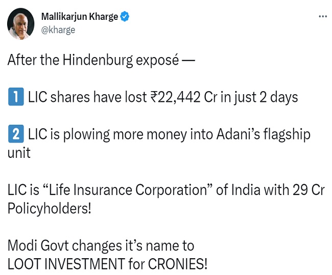 मल्लिकार्जुन खरगे ने ट्वीट कर लिखा कि सरकार ने भारतीय जीवन बीमा निगम का नाम बदलकर करोड़पतियों के लिए निवेश लूटो 'लूट इन्वेस्टमेंट फॉर क्रोनीज' कर दिया है। उन्होंने लिखा कि एलआईसी के शेयरों में केवल 2 दिनों में 22,442 करोड़ का नुकसान हुआ है। एलआईसी अडानी की प्रमुख इकाई में अधिक पैसा लगा रही है, जबकि 29 करोड़ पॉलिसीधारक एलआईसी से जुड़े हुए हैं।
