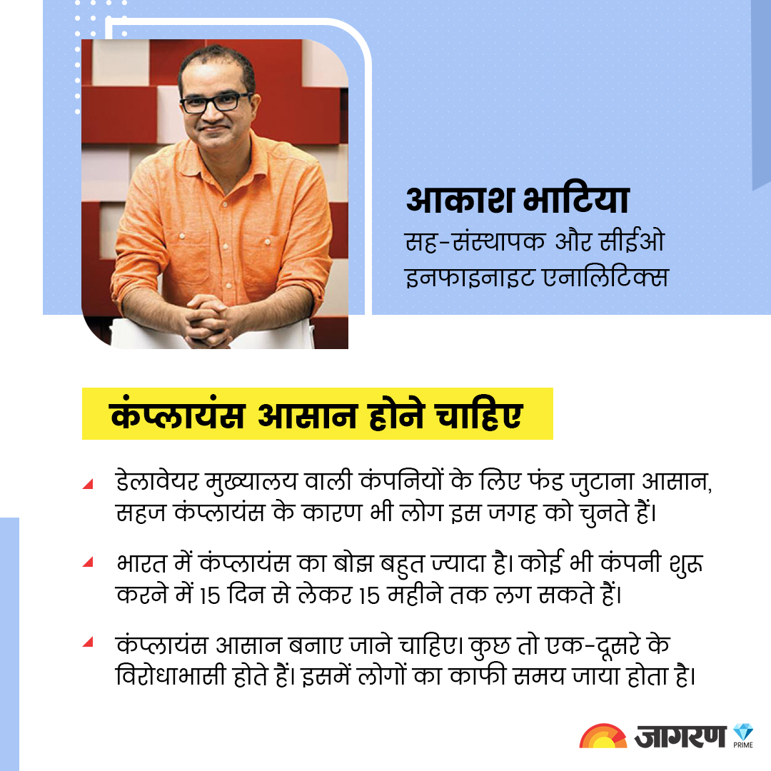 इनफाइनाइट एनालिटिक्स के सह-संस्थापक और सीईओ आकाश भाटिया जागरण प्राइम से कहते हैं, “ऐतिहासिक रूप से देखें तो अमेरिका, खासकर डेलावेयर मुख्यालय वाली कंपनियों के लिए फंड जुटाना आसान होता है। आसान कंप्लायंस, सिंगल विंडो क्लियरेंस और कंपनी हित वाली नीतियों के कारण लोग इस जगह को चुनते हैं।” भाटिया के अनुसार, “भारत में कंप्लायंस का बोझ बहुत ज्यादा है। कंपनी शुरू करने के लिए 15 दिन से लेकर 15 महीने तक लग सकते हैं। किसी भी स्टार्टअप के लिए यह रॉकेट गति से ग्रोथ या फिर मौत का अंतर होता है।”