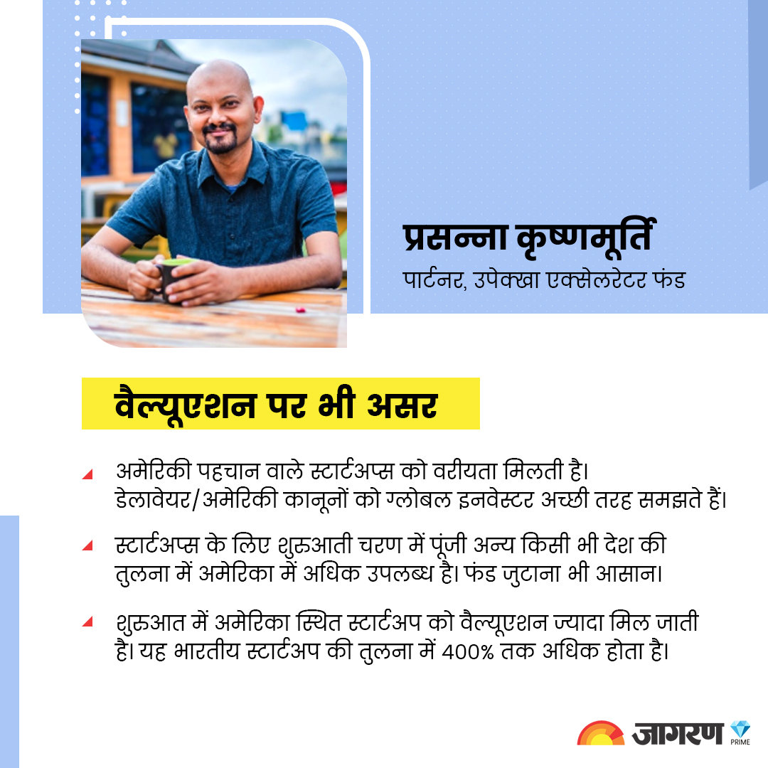 प्रसन्ना कृष्णमूर्ति के मुताबिक, “अमेरिका में निवेशक हर तरह की जानकारी रखते हैं। डोमेन विशेष में उनकी विशेषज्ञता भी होती है, खासकर टेक्निकल क्षेत्र में। इसलिए उनसे पैसे हासिल करना भी आसान होता है।” वे कहते हैं, “शुरुआती चरण में अमेरिका स्थित स्टार्टअप को वैल्युएशन भी ज्यादा मिल जाती है। यह भारतीय स्टार्टअप की तुलना में 100% से 400% तक अधिक होता है।”