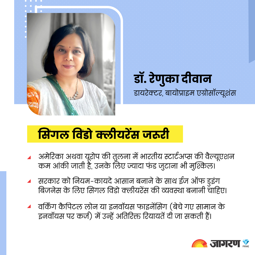 बायोप्राइम की रेणुका दीवान का सुझाव है कि सरकार को नियम-कायदे आसान बनाने के साथ ईज ऑफ डूइंग बिजनेस के लिए सिंगल विंडो क्लियरेंस की व्यवस्था बनानी चाहिए। वर्किंग कैपिटल लोन या इनवॉयस फाइनेंसिंग (बेचे गए सामान के इनवॉयस पर कर्ज) में उन्हें अतिरिक्त रियायतें दी जा सकती हैं। स्टार्टअप इंडिया स्कीम की प्रशंसा करती हुई रेणुका कहती हैं, “यह शुरुआती चरण के स्टार्टअप की मदद की दिशा में अत्यंत महत्वपूर्ण कदम है। शुरुआती वर्षों में टैक्स से छूट से कंपनी तेजी से आगे बढ़ सकती है। पेटेंट की प्रक्रिया तेज की जानी चाहिए। इससे स्टार्टअप अपनी टेक्नोलॉजी का जल्दी विस्तार कर सकते हैं।”