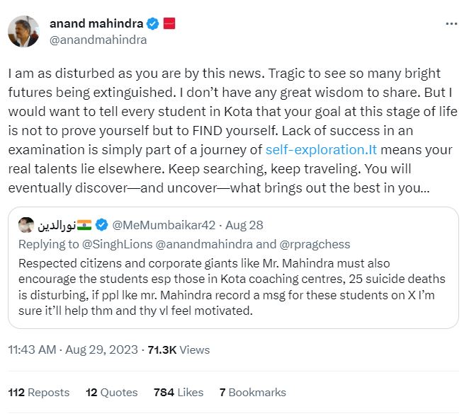 बढ़ती आत्महत्या की घटनाओं पर एक्स (औपचारिक रूप से ट्विटर) पर एक टिप्पणी का जवाब देते हुए आनंद महिंद्रा ने लिखा, “इस खबर से मैं भी उतना ही परेशान हूं जितना आप हैं। इतने सारे उज्ज्वल भविष्यों को ख़त्म होते देखना मेरे लिए दुखद है। मेरे पास साझा करने के लिए कोई महान बातें या ज्ञान नहीं है। लेकिन मैं कोटा के हर छात्र से कहना चाहूंगा कि जीवन के इस पड़ाव पर आपका लक्ष्य खुद को साबित करना नहीं बल्कि खुद को ढूंढना है।''