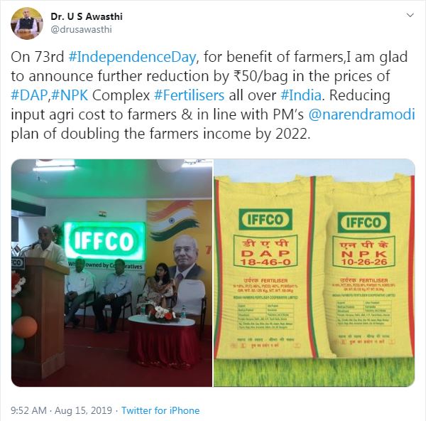 इफको के प्रबंध निदेशक यूएस अवस्थी ने एक ट्वीट के जरिए कीमतों में कमी का ऐलान किया। अपने ट्वीट में उन्होंने कहा, 'प्रधानमंत्री नरेंद्र मोदी के साल 2022 तक किसानों की आमदनी को दोगुना करने के लक्ष्य को प्राप्त करने में इससे मदद मिलेगी क्योंकि कीमतों में कमी किसानों की उत्पादन लागत को घटाएगी।'