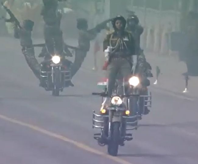 कर्तव्य पथ पर गणतंत्र दिवस समारोह में केंद्रीय सशस्त्र पुलिस की महिलाकर्मी 'नारी शक्ति' कौशल का प्रदर्शन कर रही हैं। मोटरसाइकिलों पर सवार 265 महिला बाइकर्स ने शौर्य और वीरता का प्रदर्शन किया।