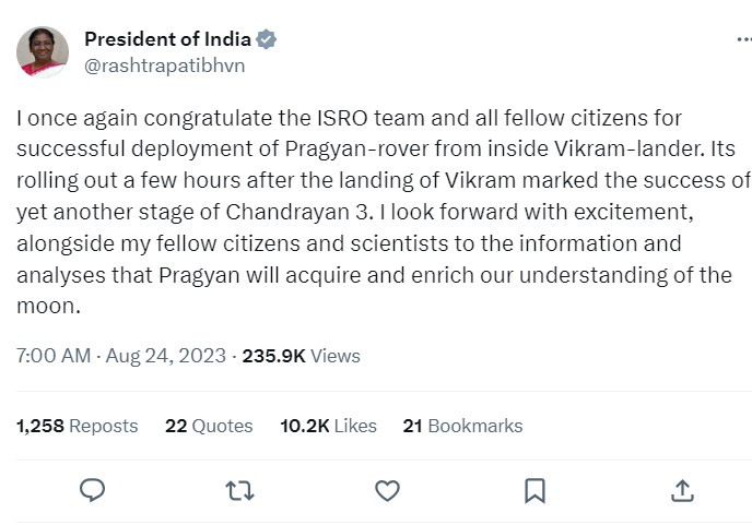 राष्ट्रपति मुर्मू ने इस मौके पर बधाई देते हुए कहा, "मैं एक बार फिर विक्रम-लैंडर के अंदर से प्रज्ञान-रोवर की सफल लैंडिंग के लिए इसरो टीम और सभी साथी नागरिकों को बधाई देती हूं। मैं अपने साथी नागरिकों और वैज्ञानिकों के साथ उत्साह के साथ उस जानकारी और विश्लेषण की प्रतीक्षा कर रही हूं जो प्रज्ञान हासिल करेगा और चंद्रमा के बारे में हमारी समझ को समृद्ध करेगा।"
