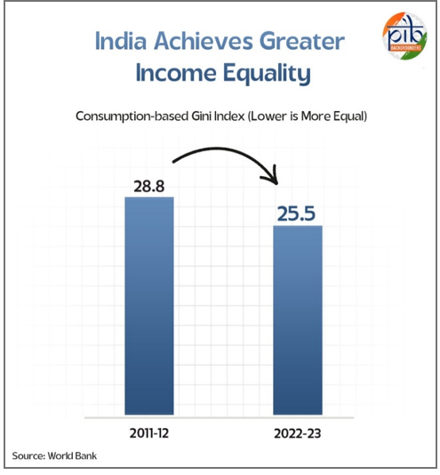 भारत का अधिक समतामूलक समाज की ओर रूख पिछले कुछ वर्षों में इसके गिनी सूचकांक में परिलक्षित होता है। 2011 में यह सूचकांक 28.8 पर मापा गया था, और 2022 में 25.5 पर पहुंच गया। यह स्थिर बदलाव दर्शाता है कि भारत ने आर्थिक विकास को सामाजिक समानता के साथ जोड़ने में लगातार प्रगति की है।