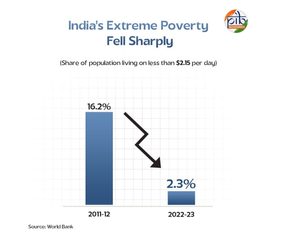 रिपोर्ट के अनुसार, पिछले दशक में 171 मिलियन भारतीयों को अत्यधिक गरीबी से बाहर निकाला गया है। प्रतिदिन 2.15 अमेरिकी डॉलर से कम पर जीवन यापन करने वाले लोगों की हिस्सेदारी, जो जून 2025 तक अत्यधिक गरीबी की वैश्विक सीमा थी, 2011-12 के 16.2 प्रतिशत से तेजी से गिरकर 2022-23 में केवल 2.3 प्रतिशत रह गई। विश्व बैंक की संशोधित अत्यधिक गरीबी सीमा $3.00 प्रतिदिन के तहत, 2022-23 की गरीबी दर को 5.3 प्रतिशत पर समायोजित किया जाएगा।