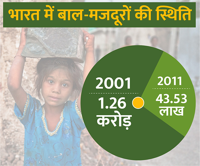 साल 2001 और 2011 की जनगणना के अनुसार श्रम एवं रोजगार मंत्रालय भारत सरकार की एक रिपोर्ट जागरण को मिली। इस रिपोर्ट के अनुसार 2001 में देश में 5-14 उम्र के कुल 25.2 करोड़ बच्चे थे, जिनमें से 1.26 करोड़ बाल मजदूरी को मजबूर थे। अच्छी बात यह है कि साल 2011 की जनगणना में 2001 की तुलना में जबरदस्त कमी देखी गई। साल 2011 की जनगणना के अनुसार देश में कुल 43.53 लाख बच्चे बाल मजदूरी कर रहे थे।