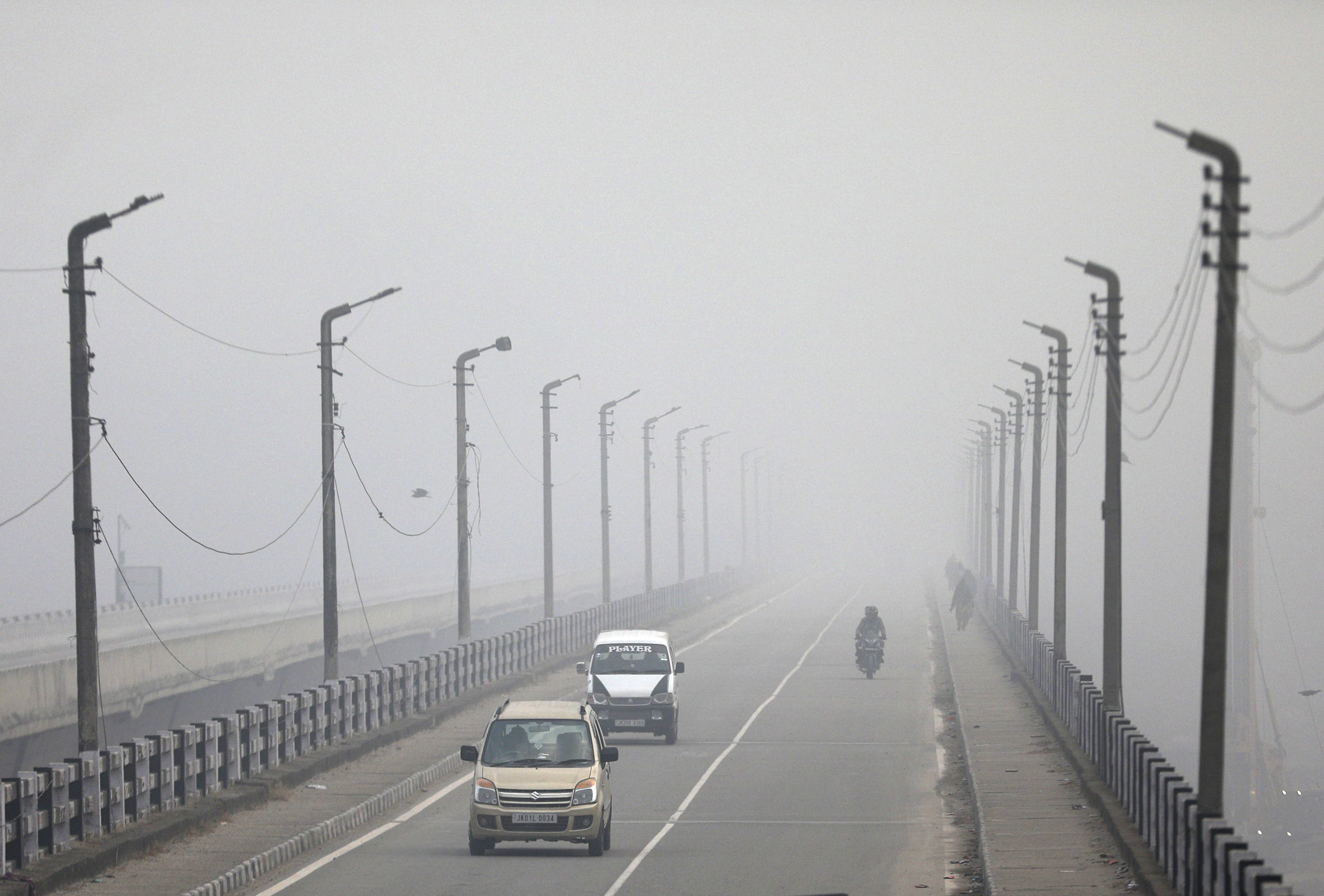 जम्मू-कश्मीर राष्ट्रीय राजमार्ग पर सर्द सुबह घने कोहरे के बीच वाहन गुजरते हुए। (फोटो - पीटीआई)