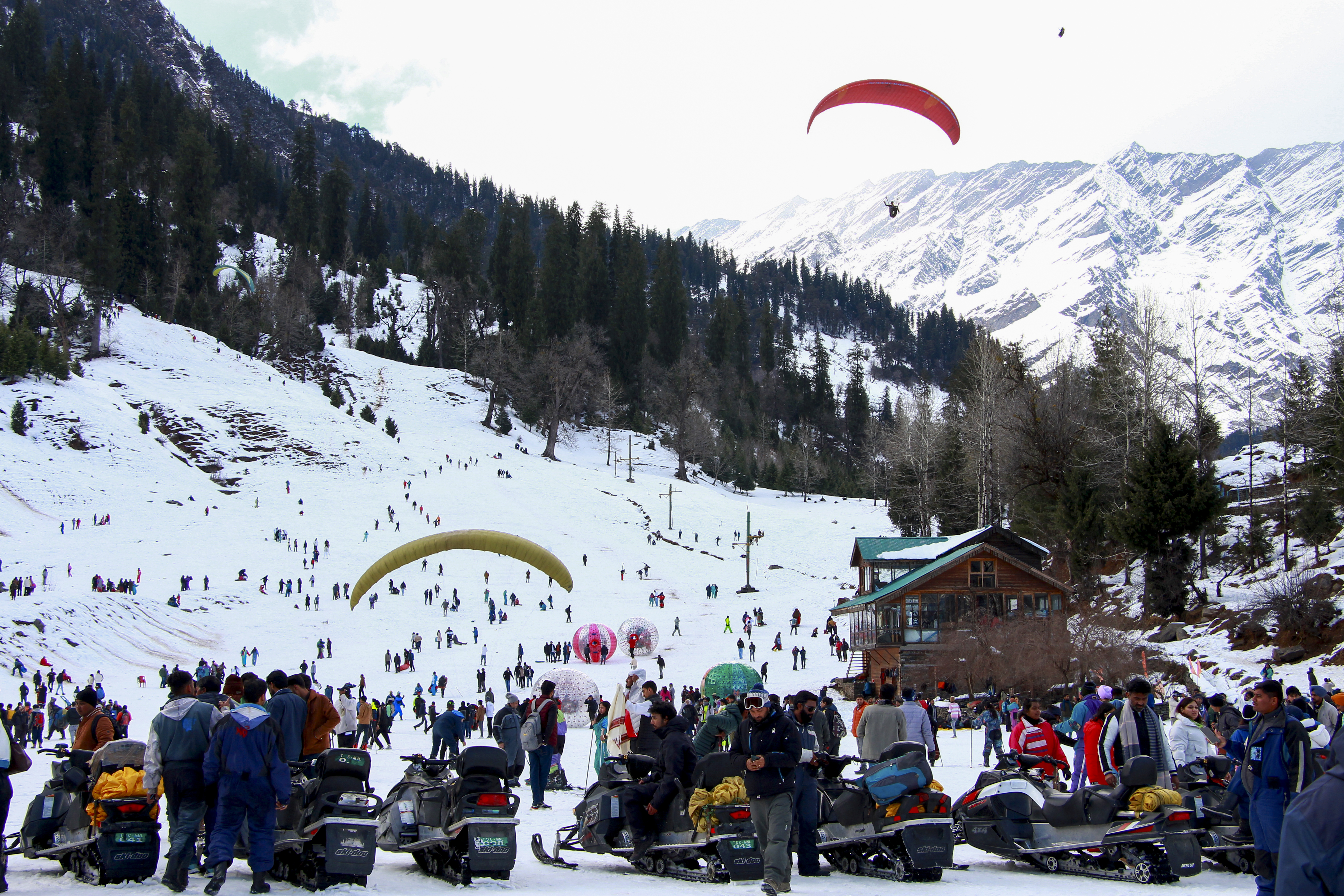 सोलंग में पर्यटक बर्फबारी का लुत्फ उठाते हुए। (फोटो- पीटीआई)