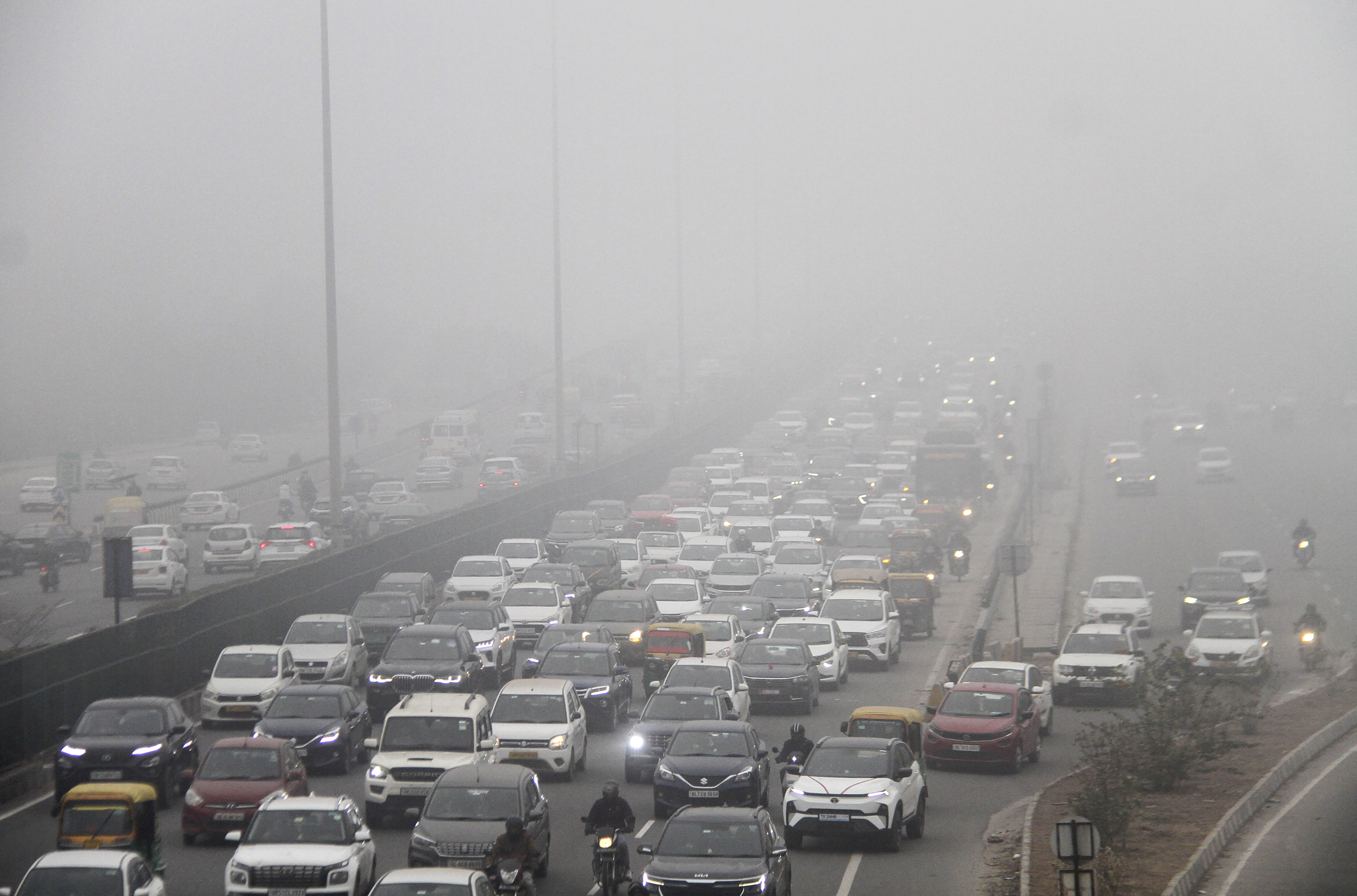 गुरुग्राम में गुरुवार को सर्दियों की धुंध भरी सुबह में कम दृश्यता के बीच दिल्ली-गुरुग्राम एक्सप्रेसवे पर वाहन चलते हुए। (फोटो- पीटीआई)