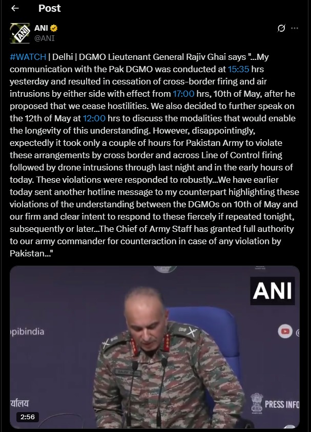बता दें कि बीते रोज विदेश सचिव विक्रम मिस्री ने एक प्रेस कॉन्फ्रेंस के जरिए बताया था कि 10 मई को शाम 5 बजे से भारत और पाकिस्तान के बीच सीजफायर लागू होगा। हालांकि, इसके चंद घंटों के बाद ही पाकिस्तान की ओर से सीमावर्ती इलाकों में सीजफायर को तोड़े जाने की सूचना सामने आई थी। फिर इसके कुछ घंटे बाद लाइन ऑफ कंट्रोल पर स्थिति सामान्य हो गई थी।